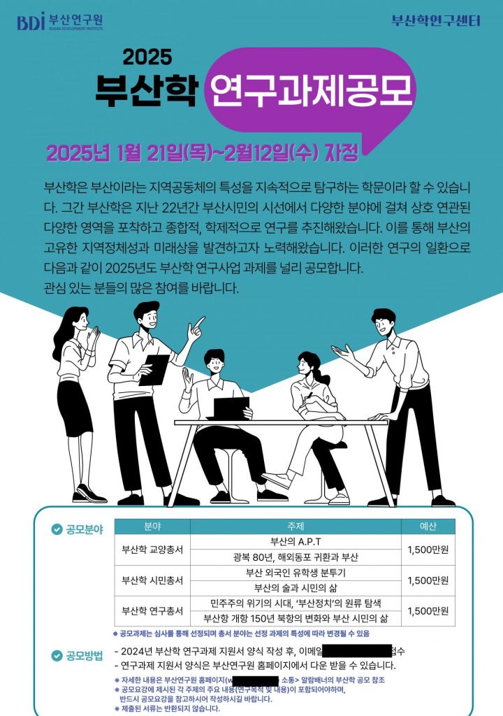 부산연구원 부산학연구센터에서 지역에 관심 있는 연구자들을 대상으로 ‘2025년 부산학 연구과제’를 23일부터 2월 12일까지 공모한다.