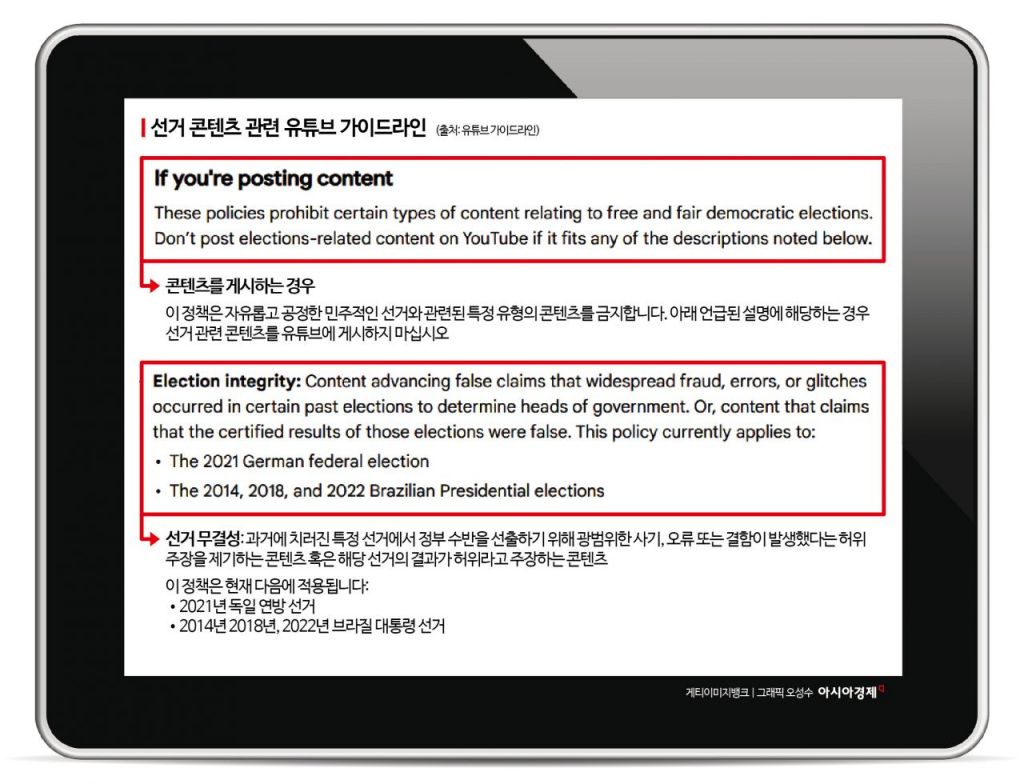 눈여겨볼 점은 유튜브가 '선거 허위 정보 정책'을 이미 마련해뒀다는 것이다. 여기에는 부정선거와 관련한 내용이 담겨있다. 가이드라인에는 '과거 정부 수반을 선출하는 특정 선거에서 광범위한 사기, 오류 또는 결함이 발생했다는 허위 주장을 조장하는 콘텐츠나 해당 선거의 결과가 허위라고 주장하는 콘텐츠는 업로드를 자제하라'고 쓰여있다. 심지어 해당 정책이 적용되는 선거 사례도 언급했는데, 2021년 독일 연방의회 선거와 2014·2018·2022년 브라질 대통령 선거가 그 대상이다. 모두 '부정선거론'이 제기됐던 곳들이다. 독일에서도 당시 조작된 투표용지가 선거에 영향을 미쳤다는 주장이 있었다. 브라질의 경우 하이르 보우소나루 전 대통령 지지자들을 중심으로 음모론이 퍼졌는데, 이들은 2023년 브라질 의회에 이어 대법원, 대통령 집무실까지 점거하는 폭동을 일으키기도 했다.