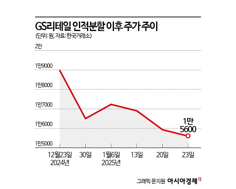 24일 한국거래소에 따르면 GS리테일의 주가는 지난달 23일 인적분할 후 21.21% 하락했다. 1만8000원대로 출발한 GS리테일의 주가는 1만5000원대로 떨어졌다. 전일 장중 1만5600원까지 하락하며 52주 신저가를 기록했다. GS피앤엘의 주가도 장중 1만9690원까지 하락하며 분할 상장 후 최저치를 기록했다. 3만100원으로 출발한 GS피앤엘의 주가는 2만원 아래로 내려왔다.
