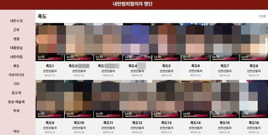 이 가운데 '폭도'로 명명된 카테고리에는 지난 19일 서울서부지법 난동 사태에 가담한 것으로 추정되는 인물 53명의 얼굴 사진이 모자이크 없이 공개돼 있다. 사진 아래에는 이름 대신 '폭도1', '폭도2' 등의 번호를 붙였으며, 이들의 얼굴 사진은 당시 현장을 생중계했던 유튜브 영상에서 캡처한 것으로 보인다. 명단에는 앞서 '백골단 논란'의 중심에 섰던 반공청년단 관계자들도 포함됐다.