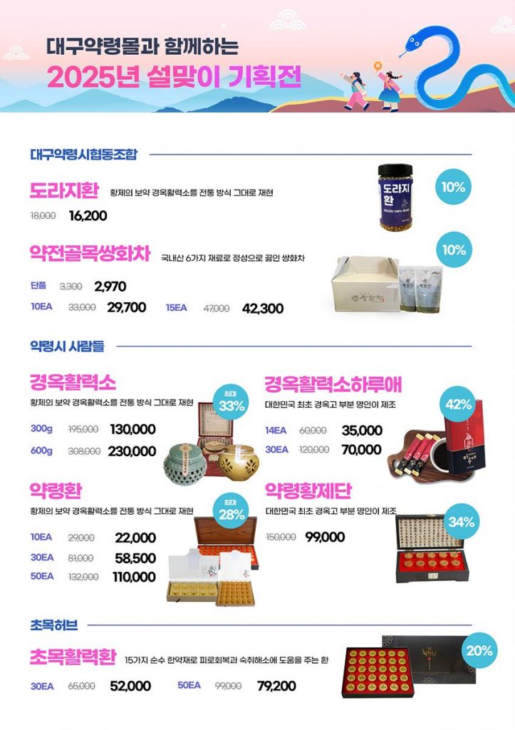서귀용 대구시 의료산업과장은 “이번 할인행사를 통해 대구 약령시의 우수 한방제품들을 저렴한 가격에 구매해 따뜻하고 건강한 설 명절을 보내시기 바란다”고 말했다.