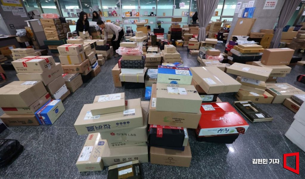 설 명절을 앞둔 23일 서울 여의도 국회 의원회관 로비에 각 의원실로 배달된 택배 상자가 가득 쌓여 있다. 김현민 기자