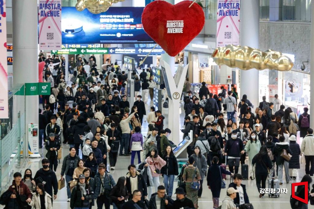 임시공휴일이 포함된 설 명절 연휴를 앞둔 24일 인천국제공항 제1여객터미널 면세구역을 찾은 여행객들로 붐비고 있다. 인천국제공항공사는 이번 설 연휴 특별 교통 대책 기간인 24일부터 다음 달 2일까지 10일간 총 214만1000명, 일평균 21만4000명의 여객이 인천공항을 이용할 것으로 전망된다고 밝혔다.