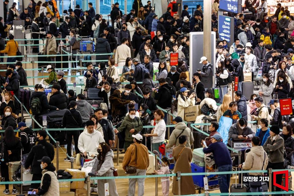 임시공휴일이 포함된 설 명절 연휴를 앞둔 24일 인천국제공항 제1여객터미널을 찾은 여행객들이 발권하기 위해 줄을 서고 있다. 인천국제공항공사는 이번 설 연휴 특별 교통 대책 기간인 24일부터 다음 달 2일까지 10일간 총 214만1000명, 일평균 21만4000명의 여객이 인천공항을 이용할 것으로 전망된다고 밝혔다.