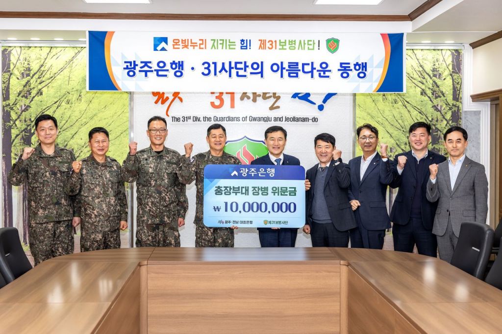광주은행(은행장 고병일)은 최근 다가오는 설 명절을 맞아 지역 향토부대인 제31보병사단(사단장 이일용)을 방문해 1,000만원의 위문금을 전달했다고 24일 밝혔다.