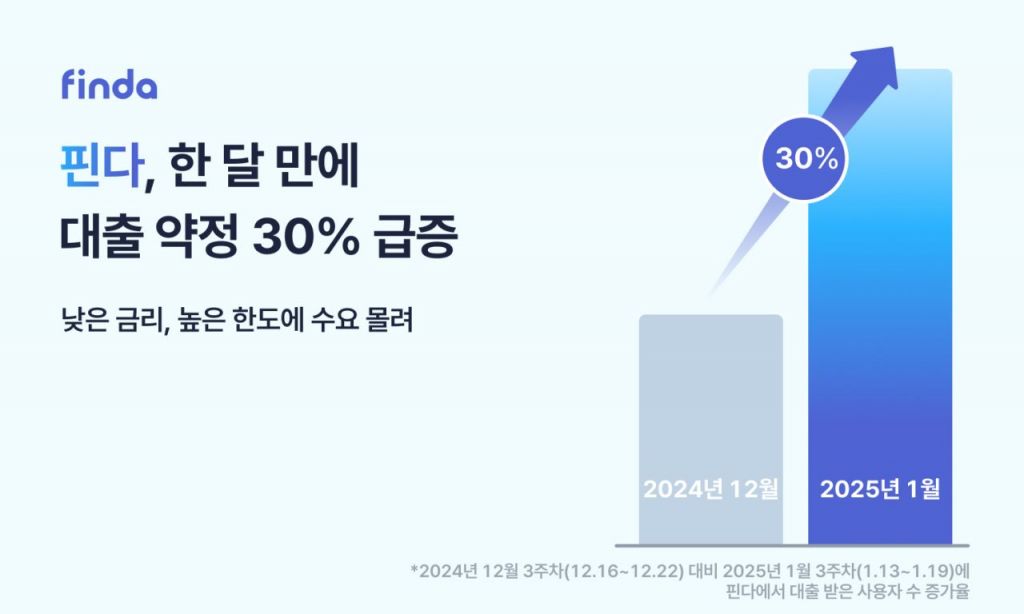 핀다에 따르면 이달 3주차(13~19일)에 핀다 앱에서 대출 약정까지 마친 사용자는 지난달 3주차(16~22일) 대비 30% 증가했다.