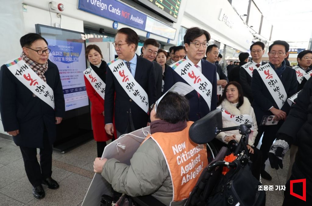 국민의힘 권영세 비상대책위원장과 권성동 원내대표가 24일 서울역에서 귀성인사를 하던 도중 전장연 회원으로부터 항의를 받고 있다.
