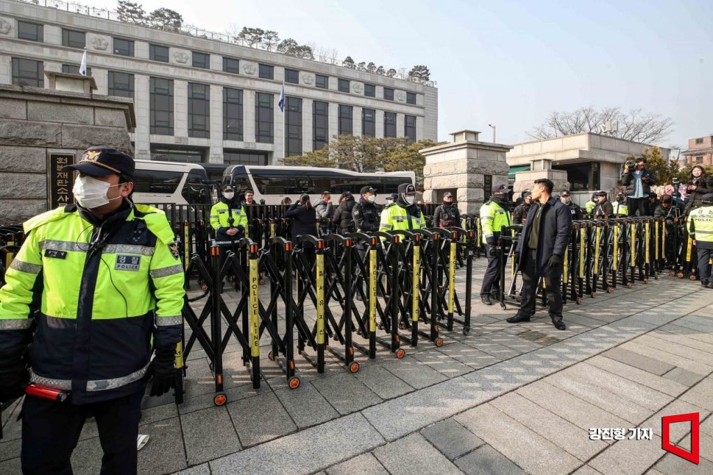 윤석열 대통령 탄핵심판 3차 변론을 앞둔 21일 서울 종로구 헌법재판소 정문에 경찰 기동대의 경계가 강화되고 있다. 강진형 기자