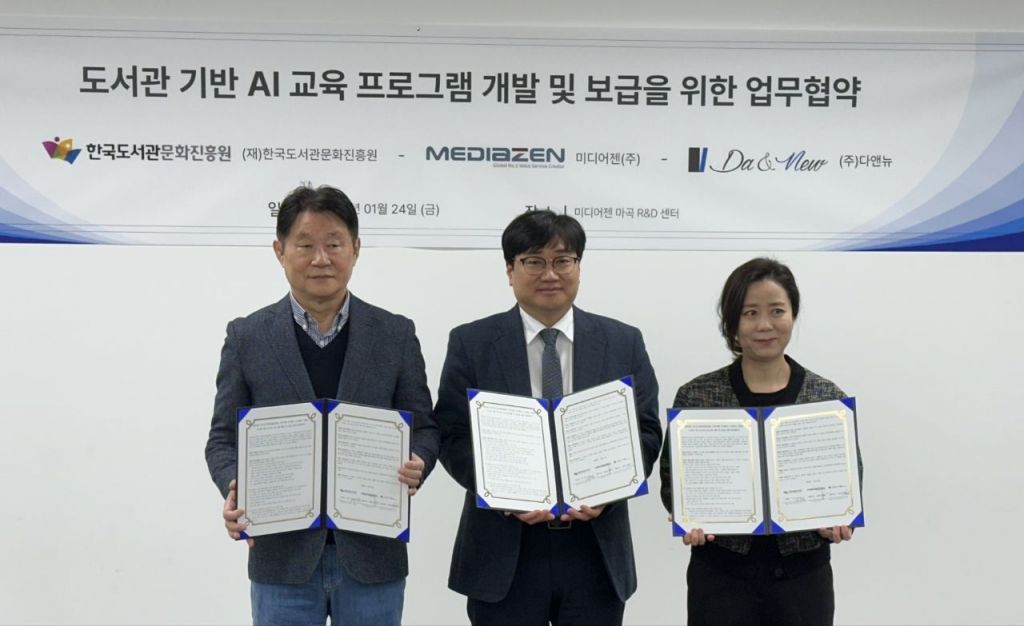 미디어젠은 한국도서관문화진흥원 및 다앤뉴와 도서관 기반의 인공지능(AI) 교육 프로그램을 개발하고 보급하기 위해 업무협약(MOU)을 체결했다고 24일 밝혔다.