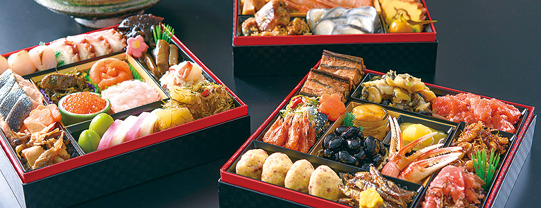 재료마다 의미도 다른데, 자손번영을 의미하는 청어알, 건강하고 성실하게 살아가기를 비는 검은콩, 풍작을 기원하는 말린 멸치 요리, 금전운을 부른다는 밤을 으깨 만든 '쿠리킹통', '운이 열린다'라는 의미로 삶은 우엉을 방망이로 양념에 무친 요리, 생선을 다시마로 말아 삶아 만든 다시마 말이 등은 필수라고 할 수 있습니다.