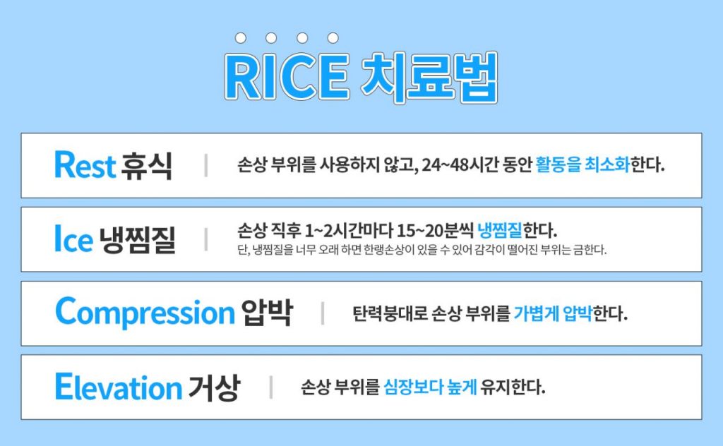 RICE 치료법은 통증을 감소시키는 Rest(안정), 부종을 감소시키는 Ice(얼음), Compression(압박), 중력을 이용해 출혈 등을 줄이는 Elevation(거상)를 의미한다. 손상 후 24시간 이내로 RICE 치료를 적용하면 회복 기간을 크게 단축할 수 있다. 빠른 치료로 부종과 염증 최소화 및 추가적인 손상 방지를 할 수 있어 빠른 회복을 돕는다.