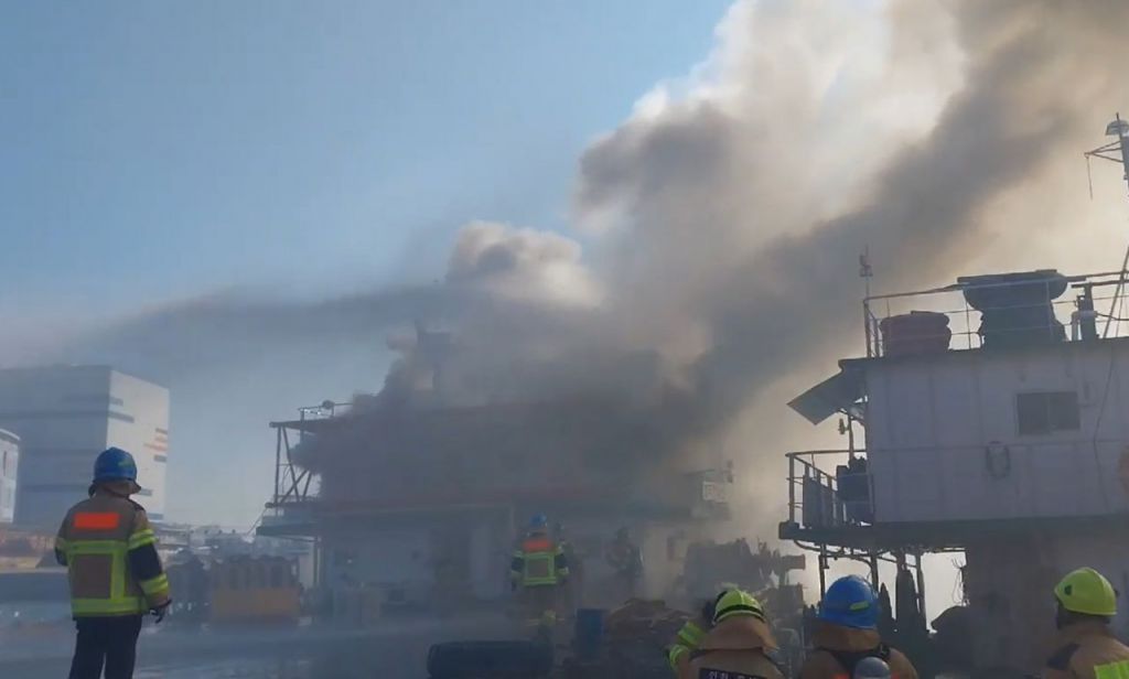 25일 오전 10시 35분께 인천시 중구 항동7가 남항 인근 해상에서 250t급 바지선에 불이 나 소방 당국이 진화 작업을 벌이고 있다. 연합뉴스, 인천소방본부
