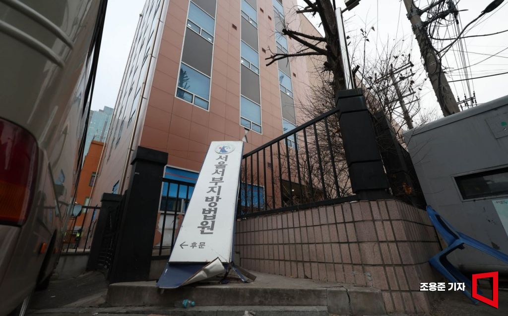 19일 새벽 윤석열 대통령이 내란 우두머리 혐의로 구속되자 지지자들이 서울 마포구 서울서부지방법원을 습격한 가운데 20일 서울 마포구 서부지법 후문에 떨어진 현판이 그대로 방치되어 있다. 조용준 기자