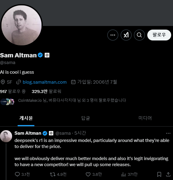 샘 올트먼 오픈AI 최고경영자(CEO)는 27일(현지시간) 사회관계망서비스 X(옛 트위터)에 딥시크 R1모델을 두고 "제작 비용을 고려한다면 인상적"이라고 말했다. 다만 이와 함께 "우리가 훨씬 뛰어난 모델을 내놓을 것"이라고 견제했다. 딥시크라는 새 경쟁자가 나타나 고무적이라고 밝혔지만, 확실하게 인정한 부분은 '가성비' 뿐이었다.