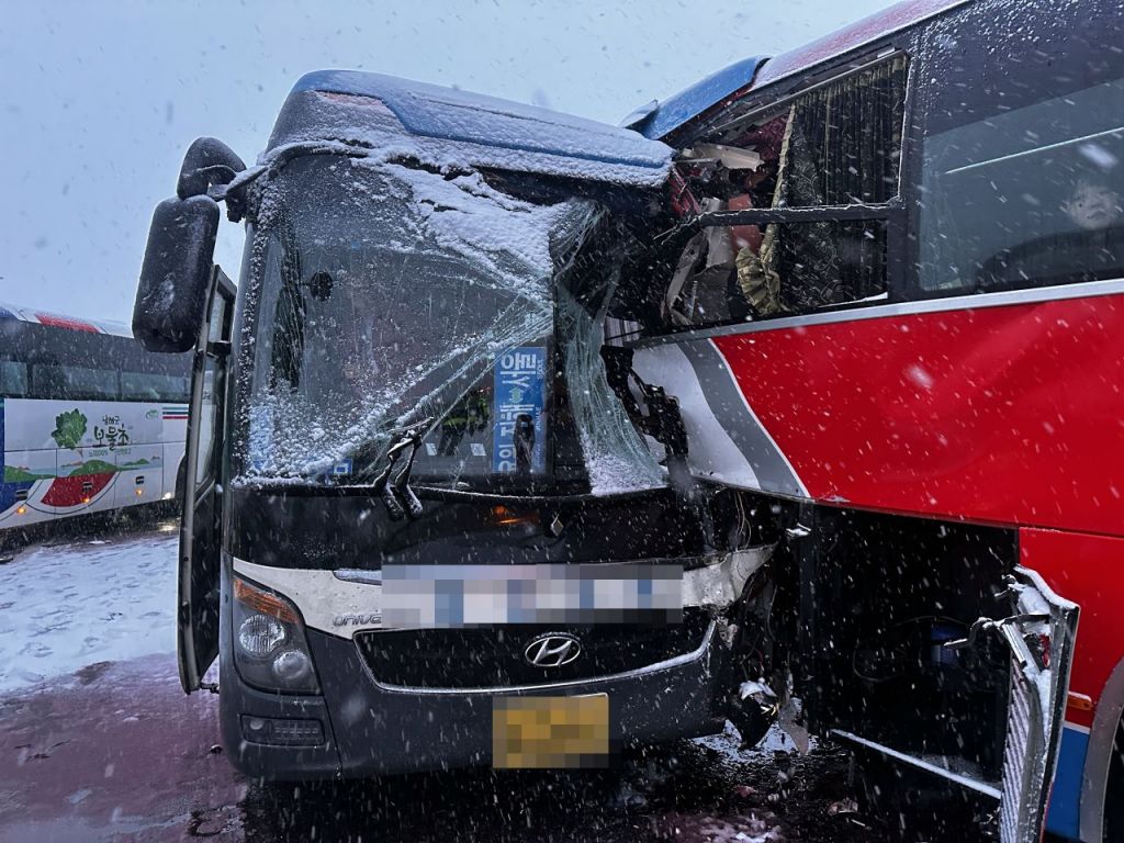 같은 시각 바로 옆 상행선 도로에서도 승용차와 고속버스가 눈길에 미끄러져 부딪혔다. 뒤따라오던 승용차 1대와 버스 4대도 연이어 추돌했다.