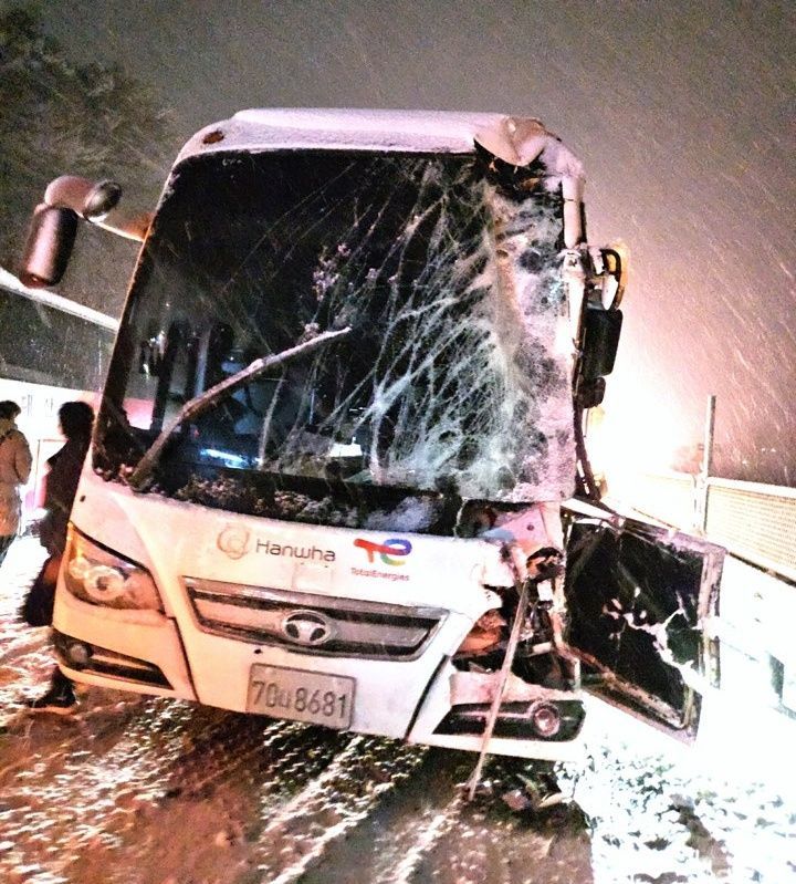 대설특보가 내려졌던 지난 27일, 충남 서산에서 버스 9중 추돌 사고가 발생해 퇴근 중이던 근로자 40여 명이 중경상을 입었다. 사진은 사고로 찌그러진 통근버스 모습. /사진=독자제공
