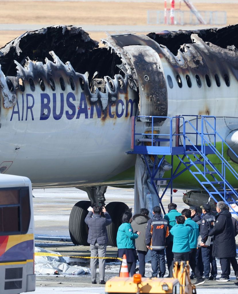 29일 부산 강서구 김해국제공항에서 부산시와 소방당국, 공항 유관기관 관계자들이 에어부산 여객기 화재 현장을 보고 있다. 지난 28일 오후 10시 15분께 김해공항 주기장에서 이륙을 준비하던 홍콩행 에어부산 항공기에서 불이 나 승객과 승무원 등 176명이 비상 탈출했다. 연합뉴스