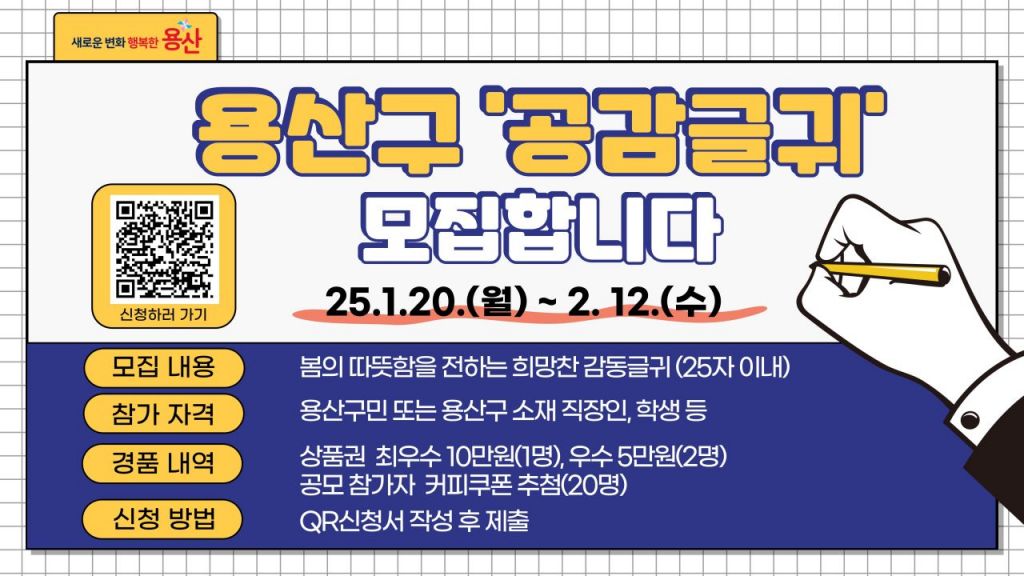 공모 대상은 구민 또는 용산구 소재 직장인과 학생이다. 공모 내용은 계절별 주제에 따라 구민들에게 공감과 희망을 줄 수 있는 글귀이며 25자 이내로 작성하면 된다.