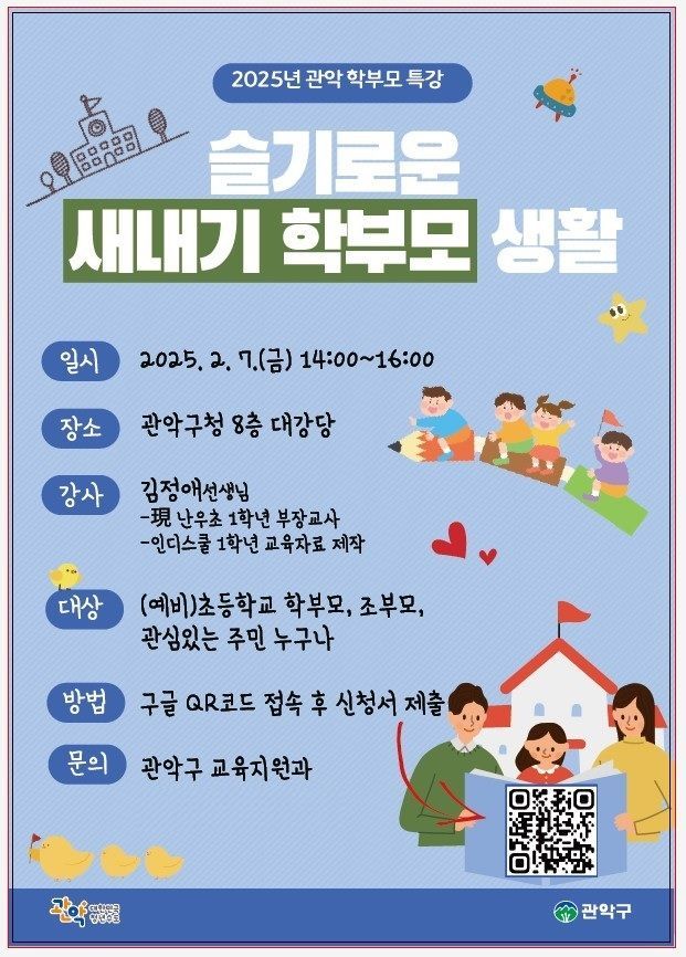 관악구(구청장 박준희)가 2월 7일 관악구청에서 예비 초등학교 학부모들을 위한 ‘2025학년도 초등학교 새내기 학부모 특강’을 개최한다.