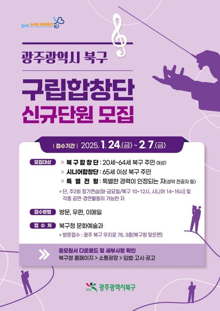 광주 북구가 다음 달 7일까지 구립합창단(북구·시니어합창단) 신규 단원을 모집한다.