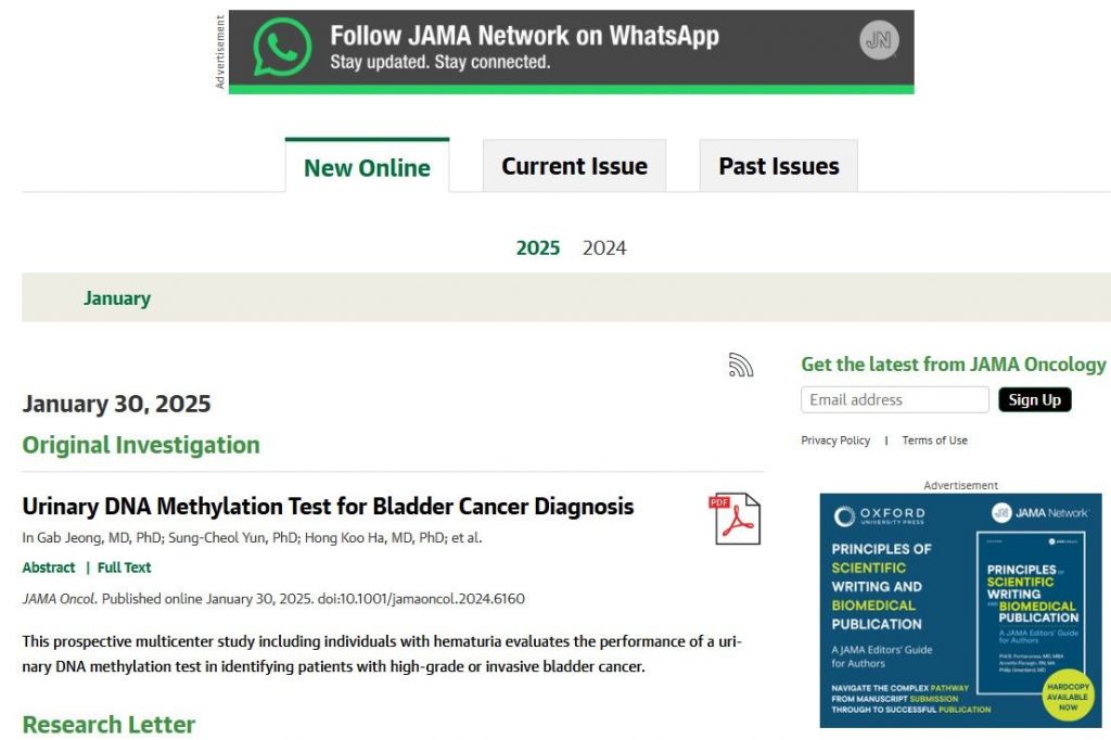 이번 연구는 국내에서 진행된 방광암 진단의 혁신성을 국제적으로 인정받은 첫 사례다. 이번 임상시험은 서울아산병원, 서울대학교병원 등 국내 10개 대학병원에서 혈뇨를 보이는 1099명을 대상으로 전향적인 연구 설계 하에 진행됐다.