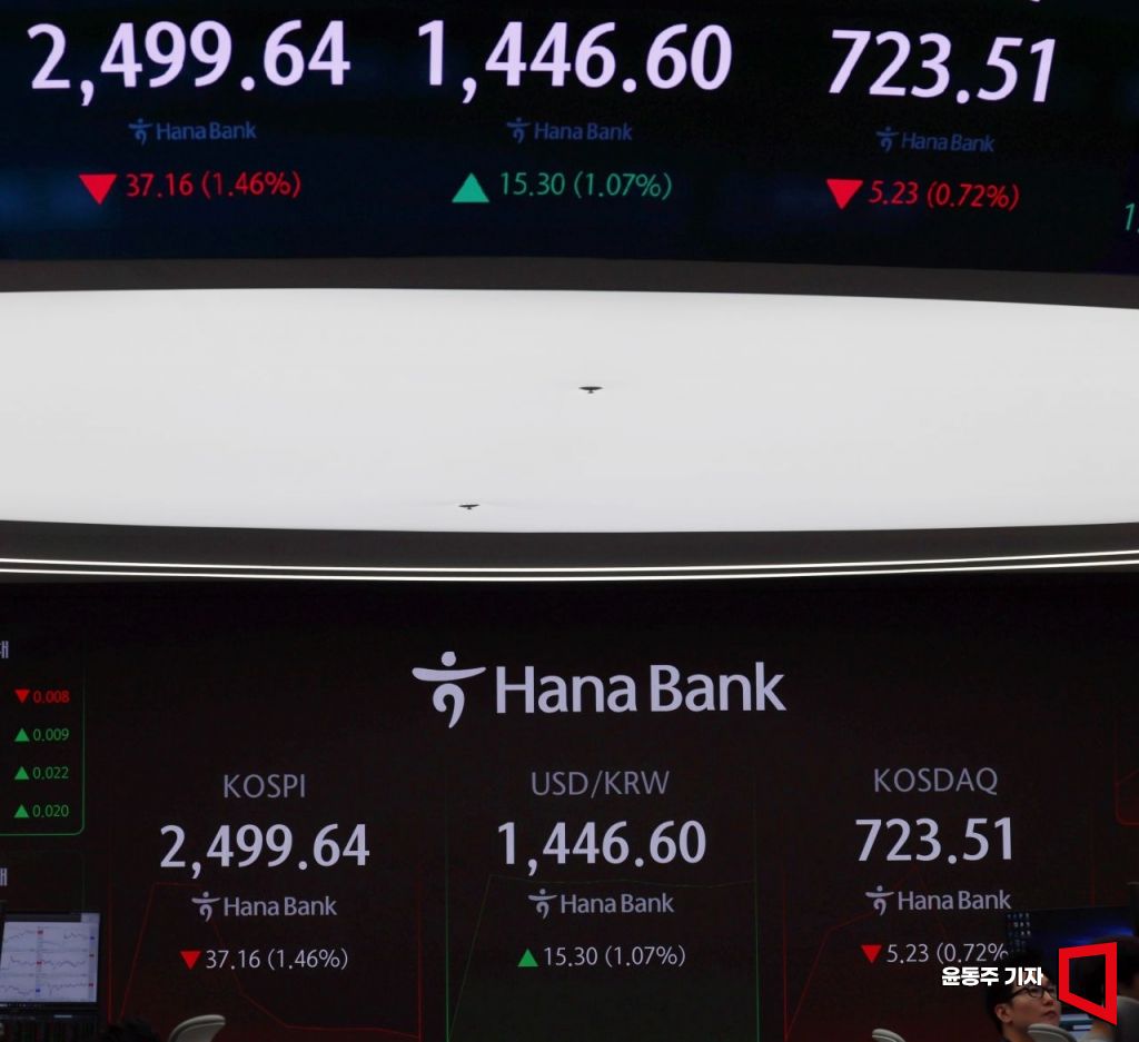 코스피지수가 설 연휴 개장 첫날인 31일 2,500을 전후 약세로 장을 시작하고 있다. 서울 중구 하나은행 본점 딜링룸 지수 현황판에 지수 등이 표시 되고 있다. 윤동주 기자