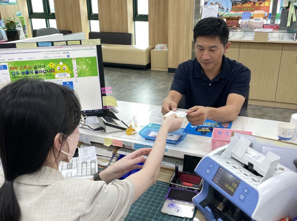 농업인이 농협에서 농어민수당을 영주사랑상품권으로 받고 있다.