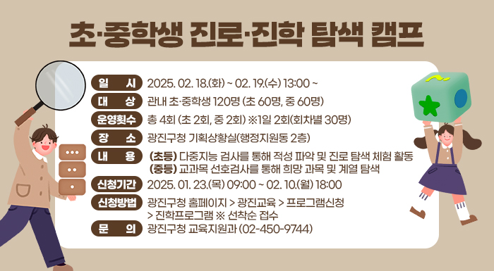광진구(구청장 김경호)가 초·중학생들을 대상으로 ‘진로 ·진학 탐색 캠프’를 운영, 참여자를 모집한다.