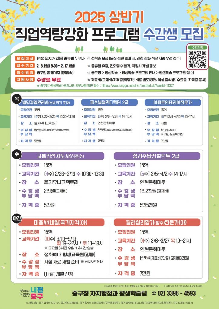 서울 중구가 이달부터 5월까지 ‘2025년도 상반기 직업역량강화 프로그램’을 운영하며 이달 17일까지 수강생을 모집한다.