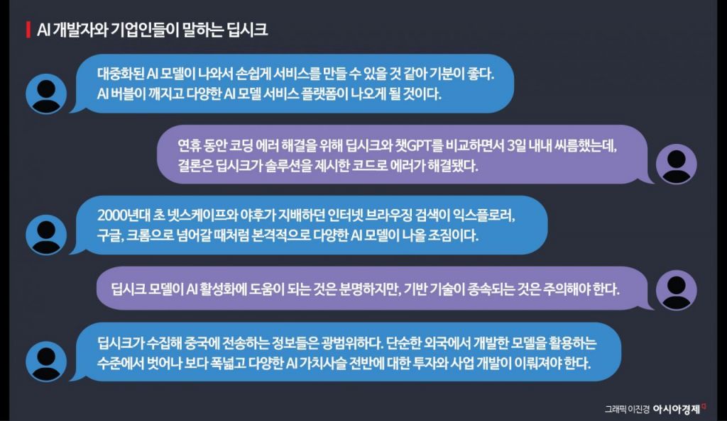 국내 AI 기업들은 기대와 우려감을 동시에 표시하고 있다. 단기적으로는 미국 빅테크(대형 정보기술 기업)의 독주를 막고 선택지를 넓힐 수 있지만, 장기적으로는 중국으로 기술 종속으로 이어질 수 있다는 염려도 있다. 20년 업력의 뉴엔AI 소속 박정호 기술연구소장은 "상용 거대언어모델(LLM)을 사용해서 AI 에이전트를 만드는 기업들의 선택지가 넓어졌다"며 "성능은 이전과 비슷하거나 더 좋아졌고 비용은 저렴해진 것"이라고 했다. 다만 그는 "향후에는 정부 지원이나 투자를 받을 때 ‘더 적은 비용으로 고성능의 AI를 개발하라’라는 요구가 나와 기업들이 어려워질 수 있다"고 전망했다. 이로 인해 민관의 투자가 줄어들면 기술 발전의 속도가 더뎌지고 결국 중국에 종속될 수밖에 없다는 것이다.