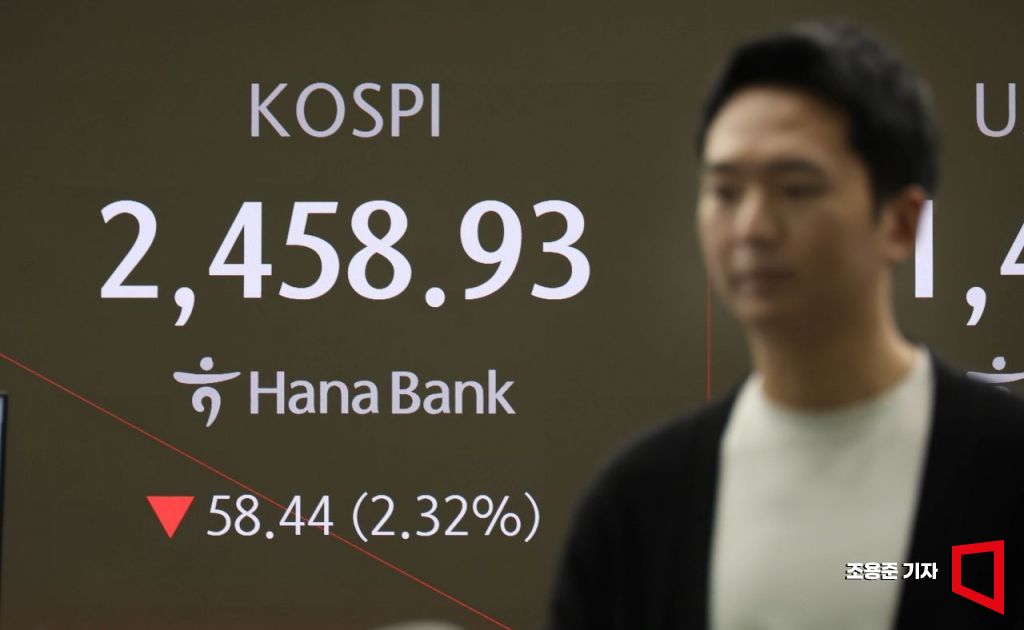 트럼프의 관세전쟁으로 국내 증시에 불확실성이 높아지면서 코스피 지수가 2500선이 무너진 3일 서울 중구 하나은행 딜링룸 현황판에 코스피 지수와 원/달러 환율 등이 표시되고 있다. 이날 코스피는 전장보다 48.63포인트(1.93%) 내린 2,468.74로, 원/달러 환율은 13.3원 오른 1,446.0원에 장을 시작했다.
