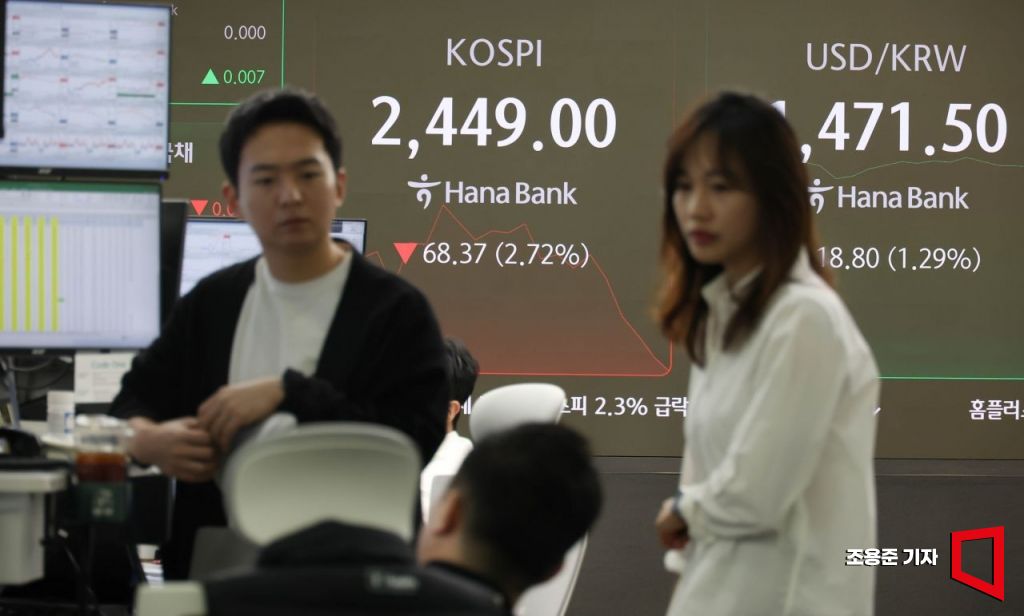 트럼프의 관세전쟁으로 국내 증시에 불확실성이 높아지면서 코스피 지수가 2500선이 무너진 3일 서울 중구 하나은행 딜링룸 현황판에 코스피 지수와 원/달러 환율 등이 표시되고 있다. 이날 코스피는 전장보다 48.63포인트(1.93%) 내린 2,468.74로, 원/달러 환율은 13.3원 오른 1,446.0원에 장을 시작했다.