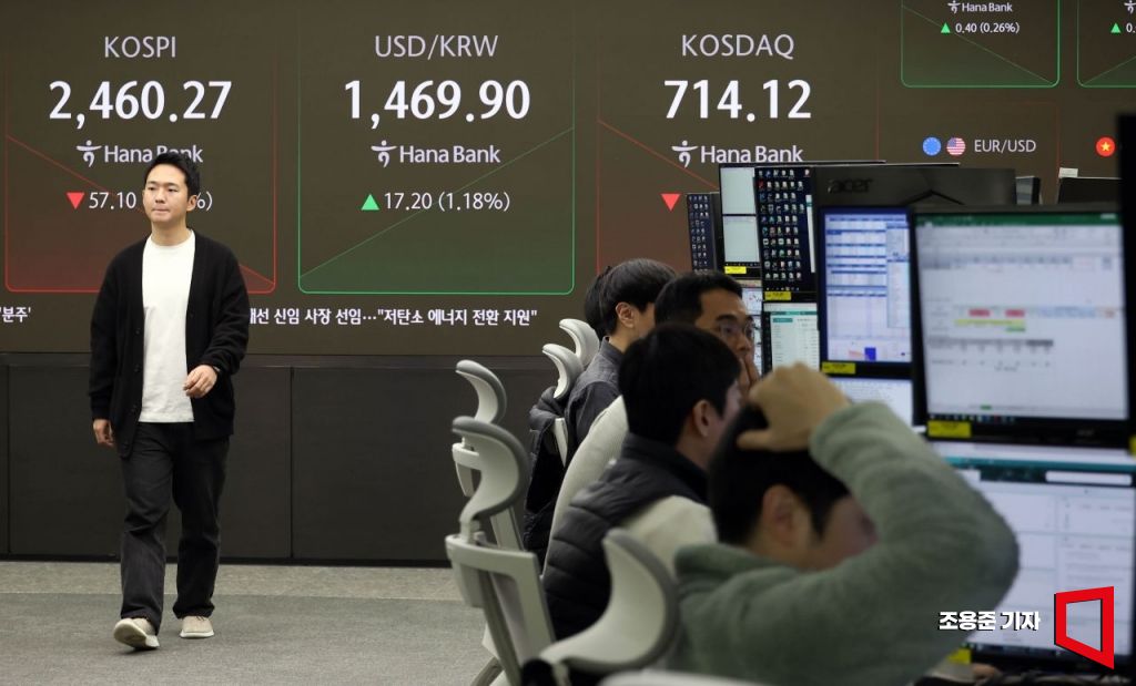 트럼프의 관세전쟁으로 국내 증시에 불확실성이 높아지면서 코스피 지수가 2500선이 무너진 3일 서울 중구 하나은행 딜링룸 현황판에 코스피 지수와 원/달러 환율 등이 표시되고 있다. 이날 코스피는 전장보다 48.63포인트(1.93%) 내린 2,468.74로, 원/달러 환율은 13.3원 오른 1,446.0원에 장을 시작했다.