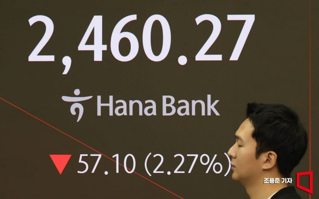 트럼프의 관세전쟁으로 국내 증시에 불확실성이 높아지면서 코스피 지수가 2500선이 무너진 3일 서울 중구 하나은행 딜링룸 현황판에 코스피 지수와 원/달러 환율 등이 표시되고 있다. 이날 코스피는 전장보다 48.63포인트(1.93%) 내린 2,468.74로, 원/달러 환율은 13.3원 오른 1,446.0원에 장을 시작했다.