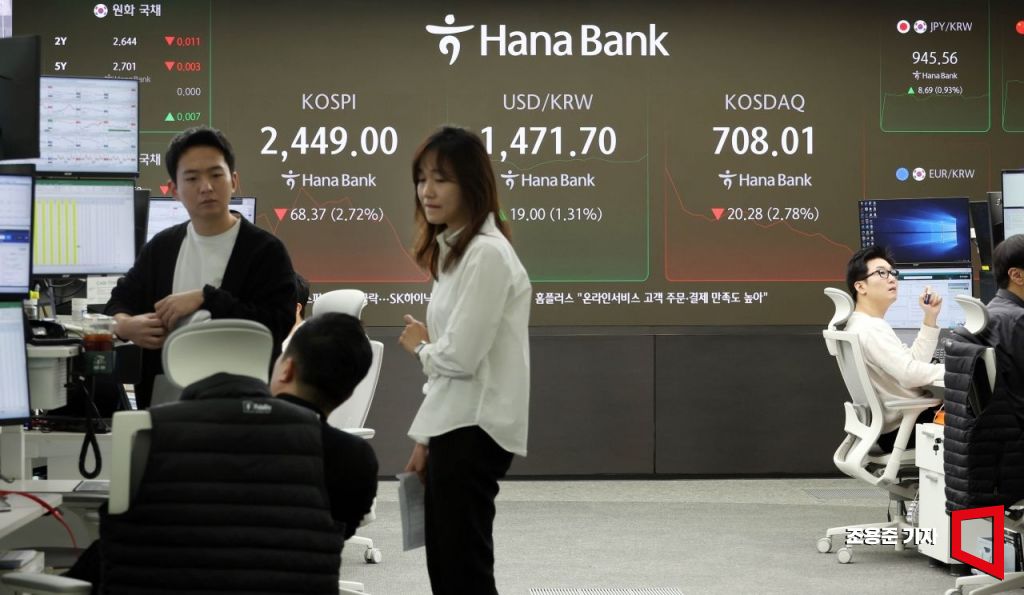 트럼프의 관세전쟁으로 국내 증시에 불확실성이 높아지면서 코스피 지수가 2500선이 무너진 3일 서울 중구 하나은행 딜링룸 현황판에 코스피 지수와 원/달러 환율 등이 표시되고 있다. 이날 코스피는 전장보다 48.63포인트(1.93%) 내린 2,468.74로, 원/달러 환율은 13.3원 오른 1,446.0원에 장을 시작했다.