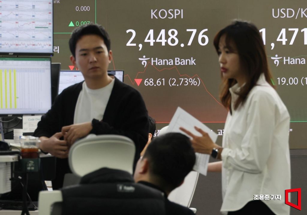 트럼프의 관세전쟁으로 국내 증시에 불확실성이 높아지면서 코스피 지수가 2500선이 무너진 3일 서울 중구 하나은행 딜링룸 현황판에 코스피 지수와 원/달러 환율 등이 표시되고 있다. 이날 코스피는 전장보다 48.63포인트(1.93%) 내린 2,468.74로, 원/달러 환율은 13.3원 오른 1,446.0원에 장을 시작했다.