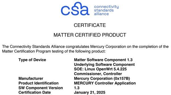 머큐리가 인증 받은 Matter 1.3은 가장 최신 버전으로 1.2에서 지원하지 않던 세탁건조기, 쿡탑, 오븐, 전자레인지, 워터 밸브, 누수감지기, 강우센서, 물 동파 감지기 등과 Matter 연동이 가능하다.
