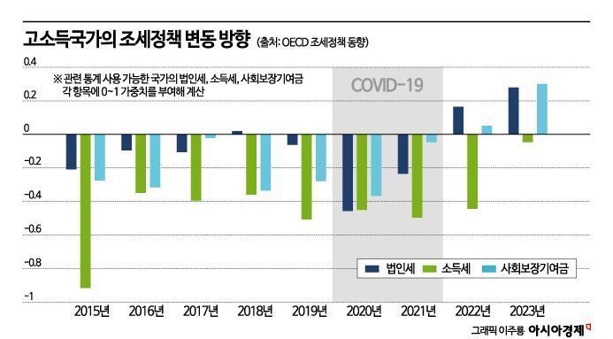 사회보장기여금은 인상하는 경우가 많았다. 여러 국가가 고령화와 의료비 증가 부담에 따라 재정 압박에 부딪히고 있기 때문으로 분석된다. 독일, 네덜란드, 스웨덴 등 다수 국가는 사회보장 시스템의 재정 안정성을 확보하기 위해 부담률을 인상했다. 호주, 그리스 등 6개 국가는 과세 범위를 확대했다. 과세 범위를 축소한 건 아르헨티나뿐이었다. 사회보장기여금은 사회보장에 필요한 연금·건강·고용 보험료 등을 의미한다.