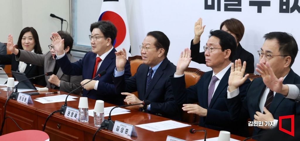 권영세 비상대책위원장을 비롯한 국민의힘 지두부가 수어의 날인 3일 국회에서 열린 비상대책위원회의에 앞서 '국민과 함께 미래로 갑니다'를 수어로 하고 있다.