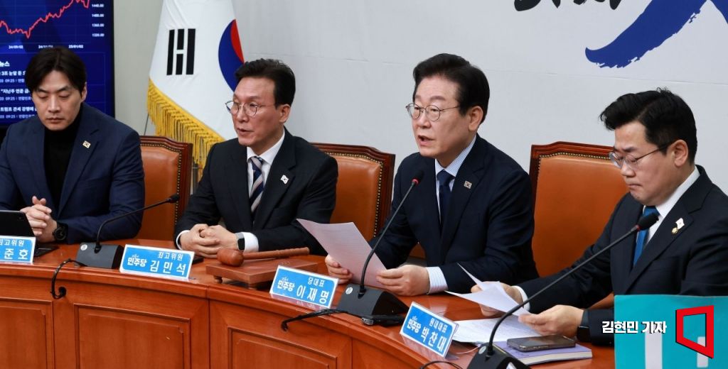 이재명 더불어민주당 대표가 3일 국회에서 열린 최고위원회의에서 발언하고 있다.