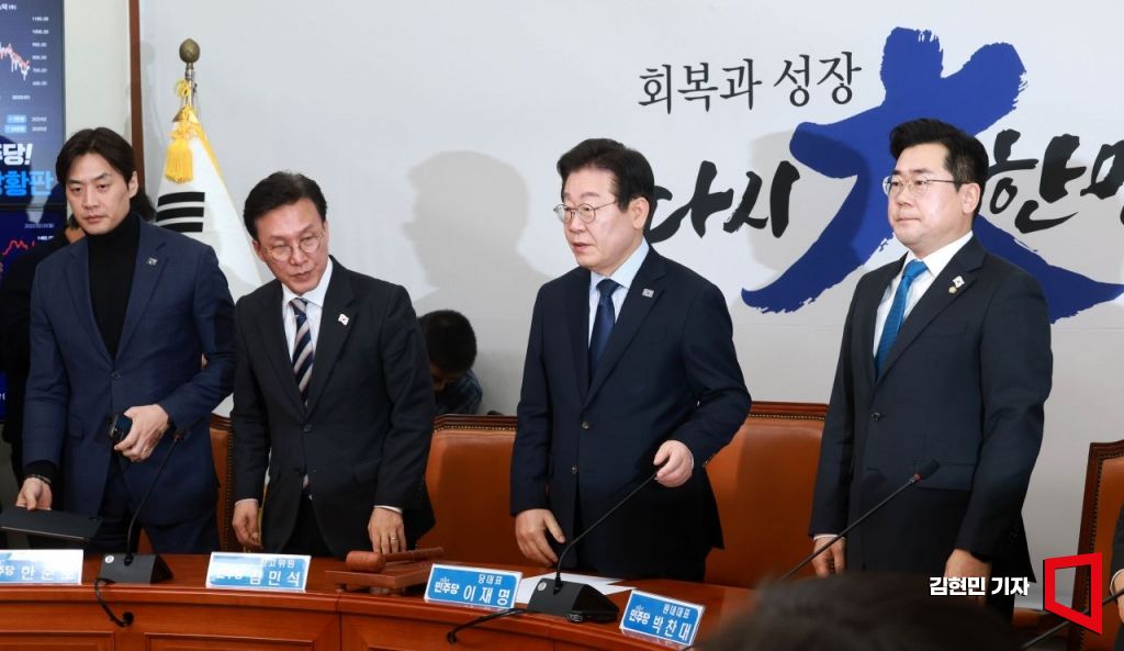 이재명 더불어민주당 대표가 3일 국회에서 열린 최고위원회의에 참석하고 있다.