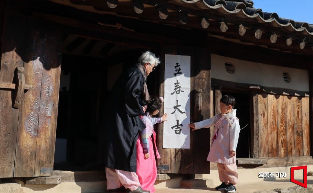 절기상 봄이 시작되는 ‘입춘'’인 3일 서울 종로구 국립민속박물관 내 오촌댁에서 새해복을 기원하는 입춘첩을 붙이고 있다. 국립민속박물관은 3일까지 '입춘첩'을 관람객에게 나누어주는 행사를 개최한다.