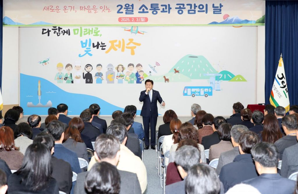 오영훈 제주특별자치도지사는 3일 오전 도청 탐라홀에서 열린 ‘2월 소통과 공감의 날’ 행사에서 협업의 가치와 도정 철학 유지의 중요성을 강조했다.