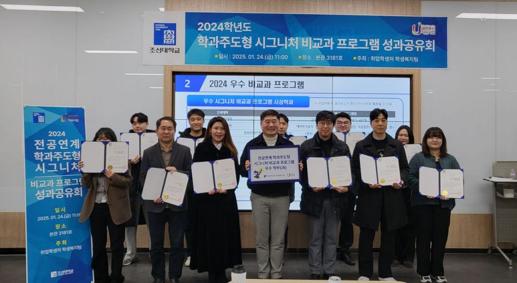 지난 1월 24일 조선대학교에서 열린 2024 전공연계 학과주도형 시그니처 비교과 프로그램 성과공유회에서 수상자들이 기념사진을 촬영하고 있다. 조선대학교 제공