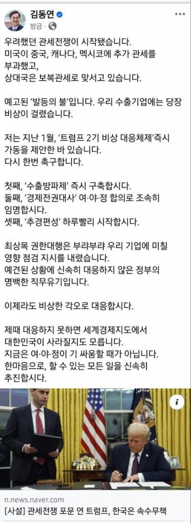 이어 "예고된 ‘발등의 불’로 우리 수출기업에는 당장 비상이 걸렸다"며 "저는 지난 1월 ‘트럼프 2기 비상 대응 체제’ 즉시 가동을 제안한 바 있는데 다시 한번 촉구한다"고 덧붙였다.
