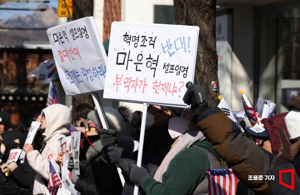 헌법재판소가 최상목 대통령 권한대행 부총리 겸 기획재정부 장관의 마은혁 헌법재판관 후보자 임명 보류 관련 헌법소원과 권한쟁의 사건 선고를 연기한다고 밝힌 3일 서울 종로구 헌법재판소 앞에서 윤 대통령 지지자들이 집회를 하고 있다.