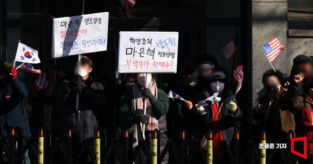 헌법재판소가 최상목 대통령 권한대행 부총리 겸 기획재정부 장관의 마은혁 헌법재판관 후보자 임명 보류 관련 헌법소원과 권한쟁의 사건 선고를 연기한다고 밝힌 3일 서울 종로구 헌법재판소 앞에서 윤 대통령 지지자들이 집회를 하고 있다.