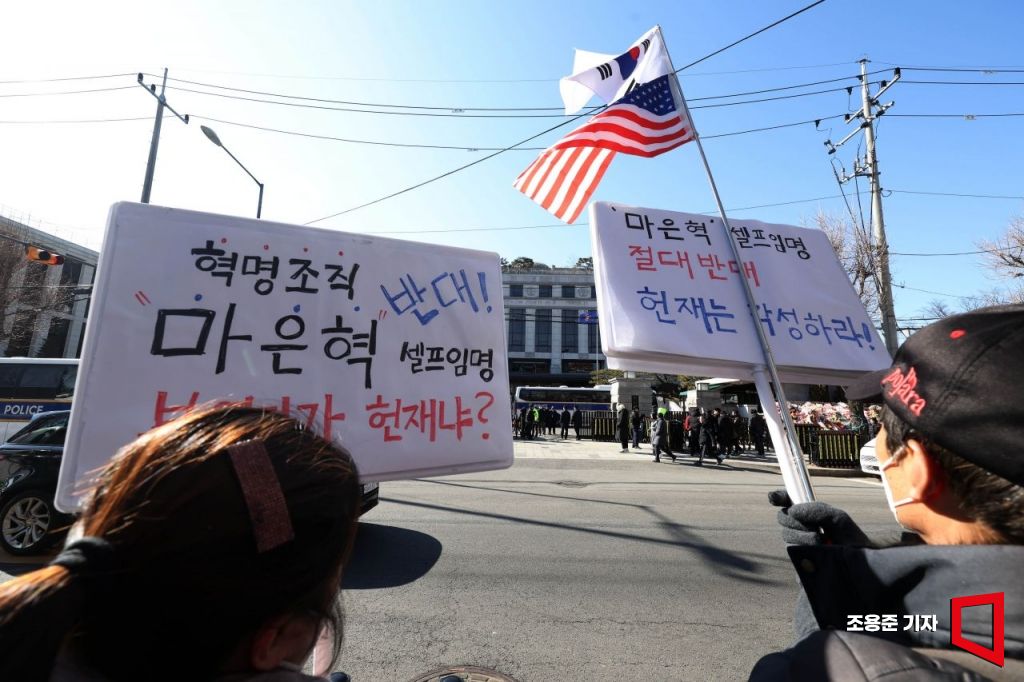 헌법재판소가 최상목 대통령 권한대행 부총리 겸 기획재정부 장관의 마은혁 헌법재판관 후보자 임명 보류 관련 헌법소원과 권한쟁의 사건 선고를 연기한다고 밝힌 3일 서울 종로구 헌법재판소 앞에서 윤 대통령 지지자들이 집회를 하고 있다.