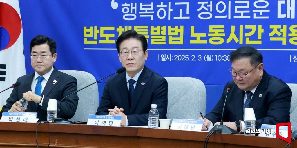 이재명 더불어민주당 대표가 3일 국회에서 열린 당의 세 번째 정책 디베이트인 '행복하고 정의로운 대한민국, 반도체특별법 노동시간법 적용 제외 어떻게'를 주재하고 있다.
