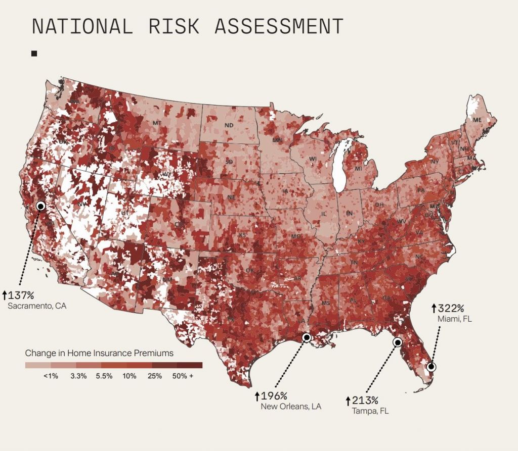 일례로 해안 지역은 해수면 상승으로 위협을 받고 있으며 내륙에선 폭염으로 인한 산불, 가뭄, 홍수, 허리케인 등으로 인한 피해가 늘었다. 자연재해의 빈도와 강도가 증가하면서 전례 없는 수준의 재산 피해가 발생해 보험사들이 보험료를 인상하거나 고위험 지역에서의 보험 상품을 철회하기도 했다.